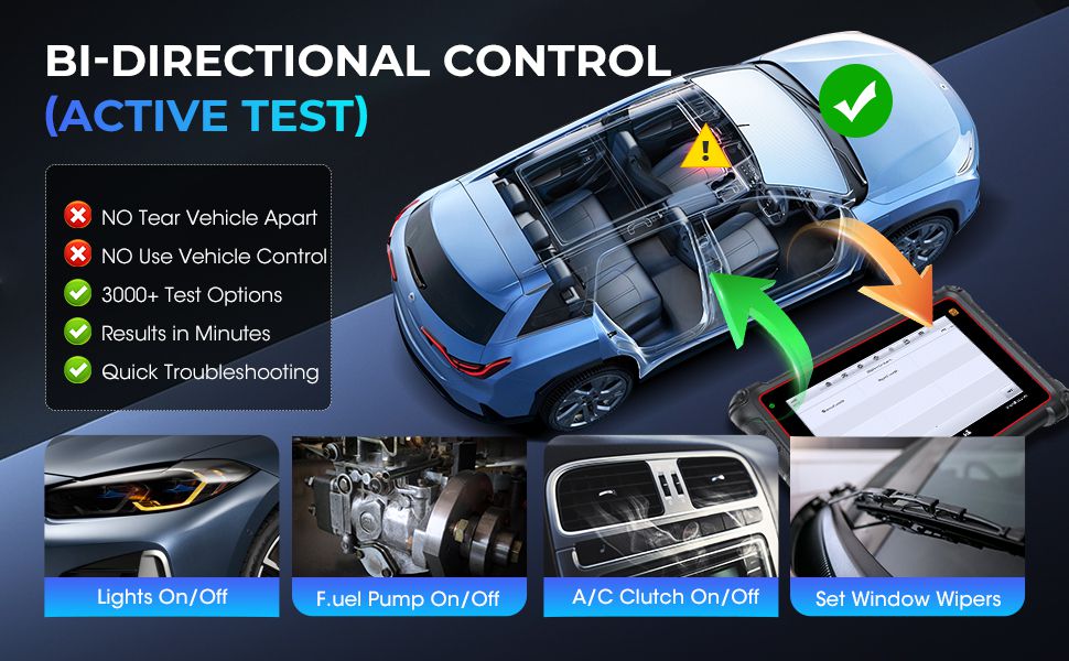 [Tests actifs]Contrôle bidirectionnel de relais, d'injecteurs, de bobines, de solenoïdes, de vannes, d'actionneurs, etc. pour les essais sans commande manuelle;obtenir des résultats rapides en 5 minutes.