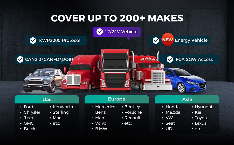 15. Couverture universelle des véhicules: servir les voitures de voyageurs et les camions lourds.Couvre 99% des modèles américains, asiatiques, européens et plus de 10 000 véhicules (1996-2022).Le camion nécessite